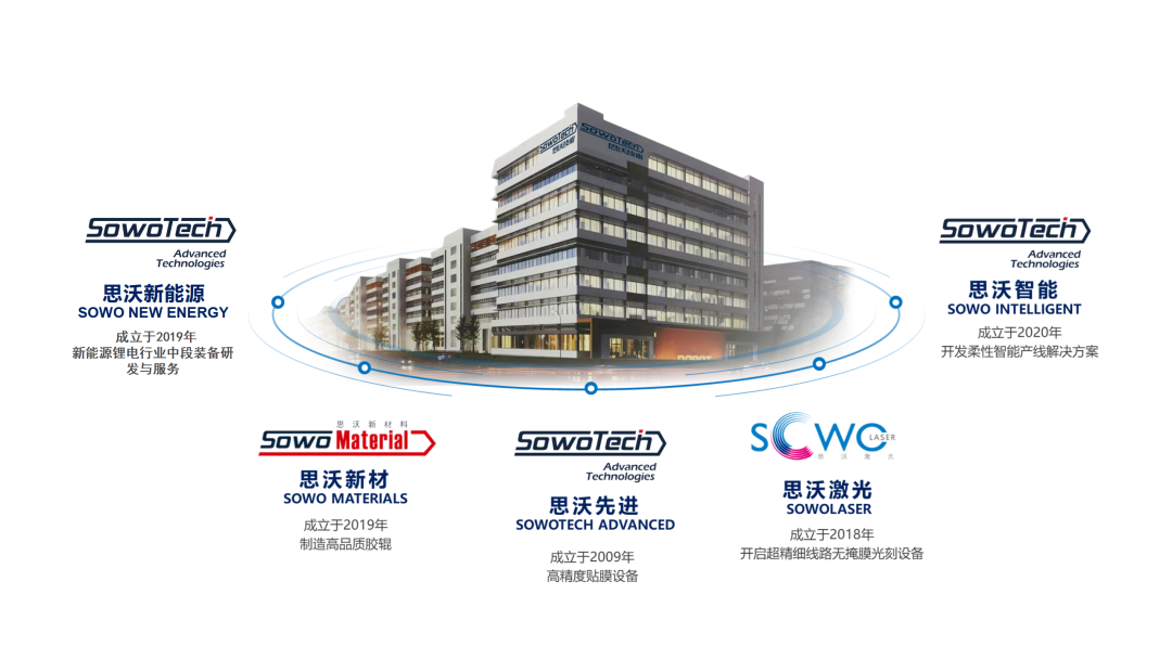 集團旗下?lián)碛懈呔荣N膜設(shè)備思沃先進裝備,開發(fā)柔性智能產(chǎn)線解決方案的思沃智能,開啟超精細(xì)線路無掩膜光刻設(shè)備的思沃激光,新能源鋰電設(shè)備思沃新能源,制造高品質(zhì)膠輥的思沃新材。