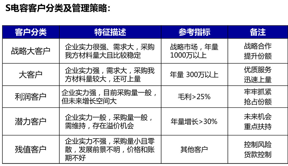 2、明確了電容業(yè)務(wù)戰(zhàn)略重點(diǎn),包括重點(diǎn)市場、重點(diǎn)產(chǎn)品、重點(diǎn)客戶,進(jìn)行了電容業(yè)務(wù)戰(zhàn)略布局,幫助企業(yè)建立了科學(xué)的大客戶銷售服務(wù)模式。