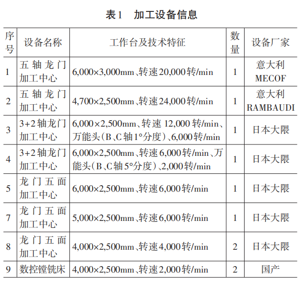 加工設(shè)備包括龍門(mén)五面加工中心4臺(tái),五軸龍門(mén)加工中心2臺(tái),3+2軸龍門(mén)加工中心2臺(tái),數(shù)控機(jī)床2臺(tái),搖臂鉆床3臺(tái),能夠滿足承接各類汽車模具覆蓋件加工需求,主要加工設(shè)備情況如表1所示。